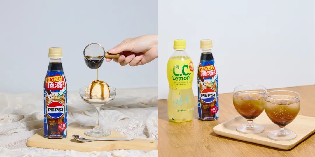 今年2月三得利“Home Drink Bar”系列推出的“百事可乐浓缩液”新品,则给出了其与柠檬味碳酸水、香草冰淇淋混合的调制方案。