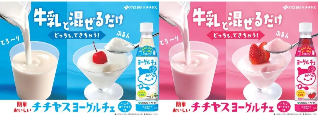 当牛奶量达到饮料的2倍,杯中的混合物会变得接近固态,形态类似果冻;当牛奶量达到饮料的4倍,杯中液体则会有酸奶的风味。在产品海报中,伊藤园也分别展示出两种口味饮料调制出的“酸奶”和“甜品”。