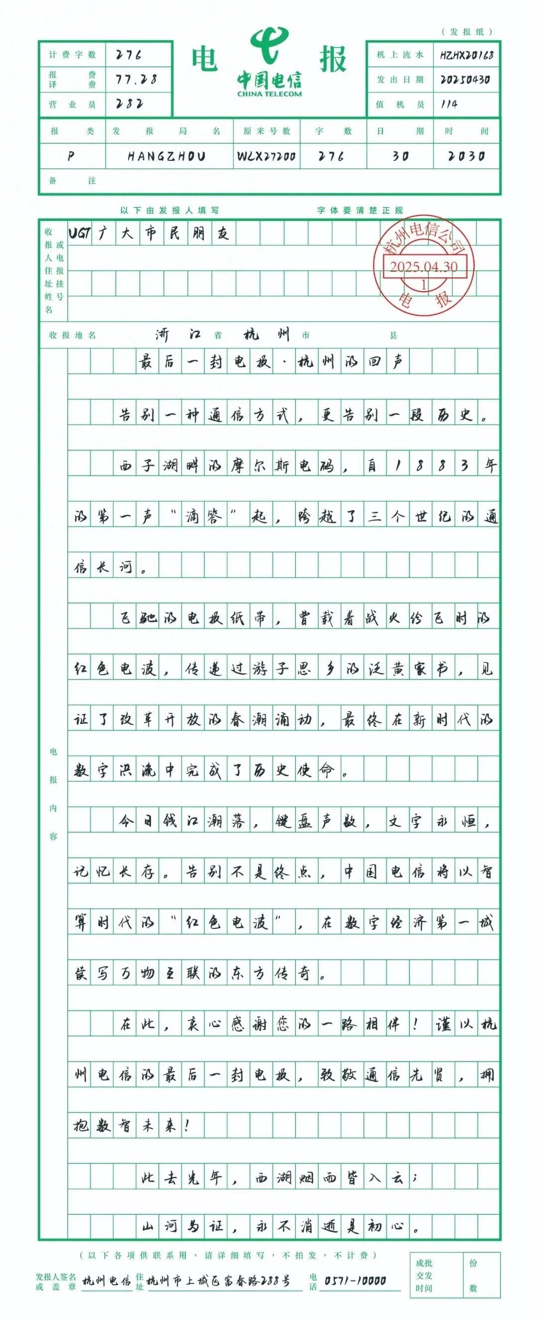 今年5月1日起,杭州地区的电报服务全面停止。许多人因此在电信营业厅外排长队,想赶在4月30日用一封电报纪念这一即将消失的电波。4月30日,官方统计杭州发出的电报有5846封。中国电信以电报模版设计了一张文案海报,向广大市民朋友做最后的道别,感谢大家的一路相伴。