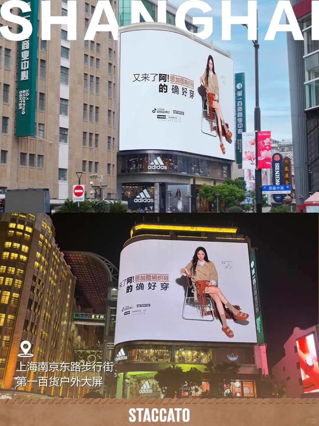 与此同时,在位于上海南京路的户外大屏上,思加图还投放了特别设计的海报——文案里又是“阿”又是“的”的,这两个字还被加粗了。仔细看,思加图巨大的海报底下是阿迪达斯的门店,而杨幂又曾经是adidas的代言人。思加图把阿迪达斯压在下面?此番巧合 让人不禁猜测品牌是故意为之。