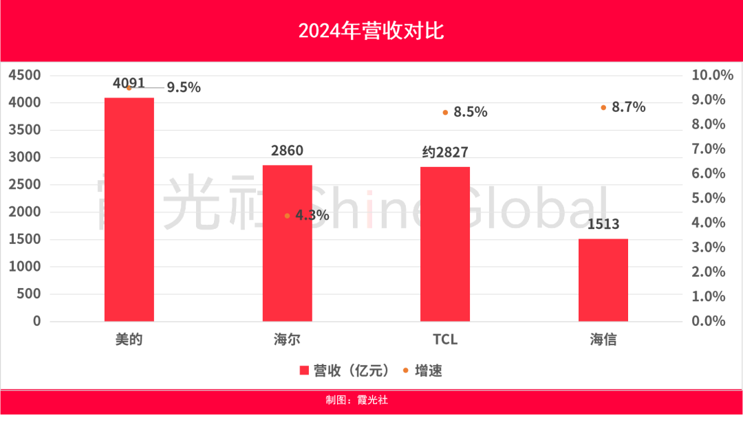 从2024年财报来看,五大家电巨头除了格力(格力2024全年营收1900亿,同比下滑7.31%),其余四家均实现了营收增长,其中美的、海信、TCL三家增长均超过7%。