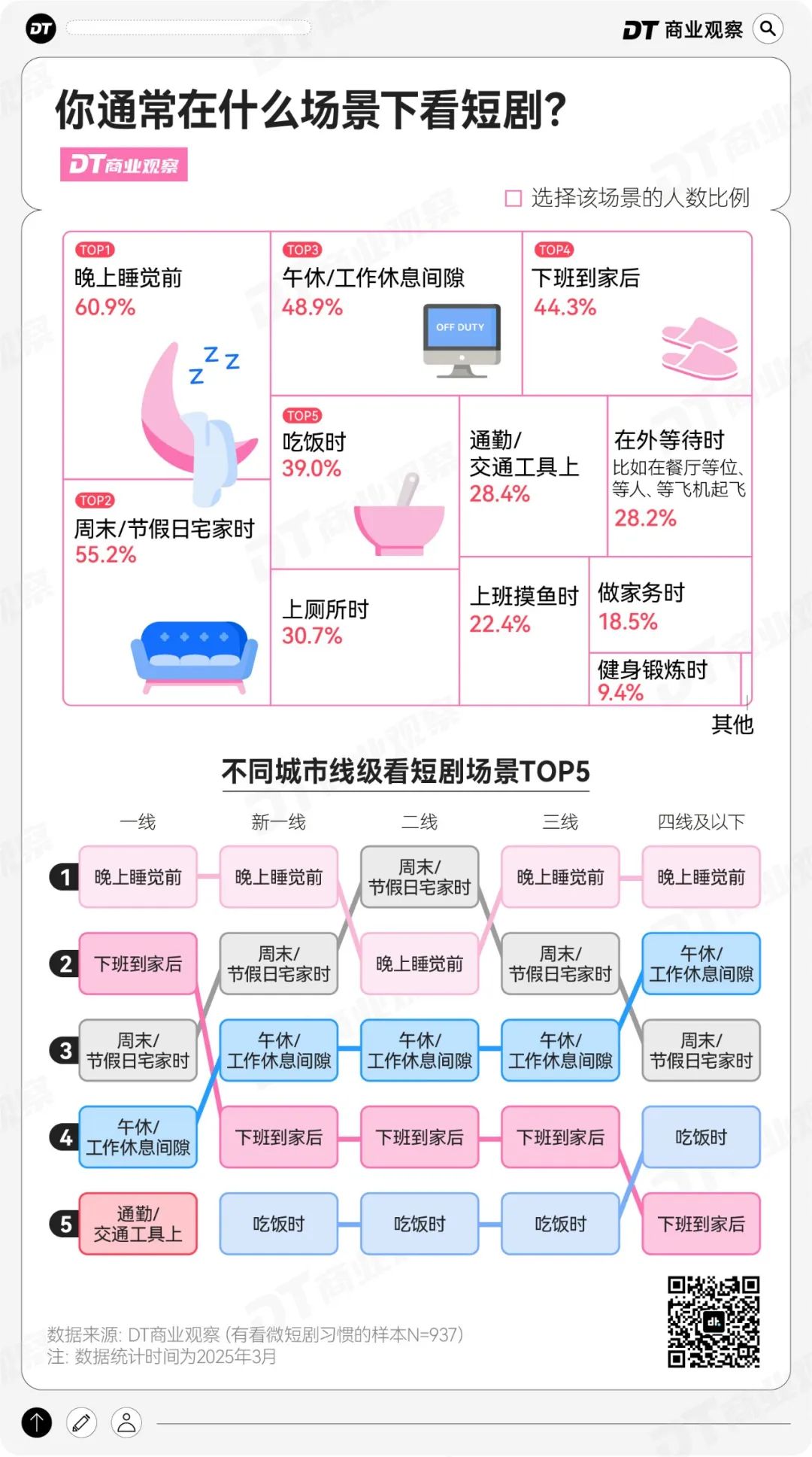 其中,一线城市除了晚上睡觉前看短剧,第二大场景就是“下班到家后”(51%),选择比例高于其他城市。