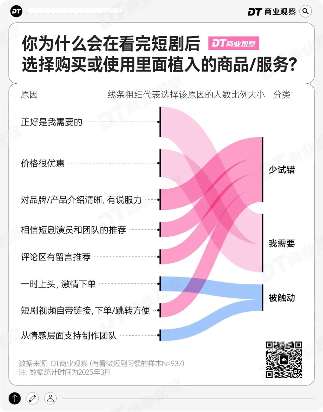 根据调研,大家之所以看完短剧会购买以上品类,首先是因为“正好是我需要的”和“价格很优惠”。