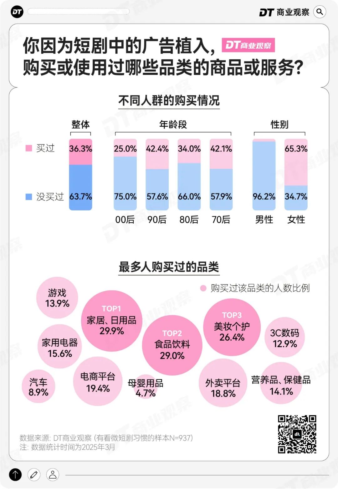 96.4%的男性从未因短剧植入下单,90后和70后更容易被击中