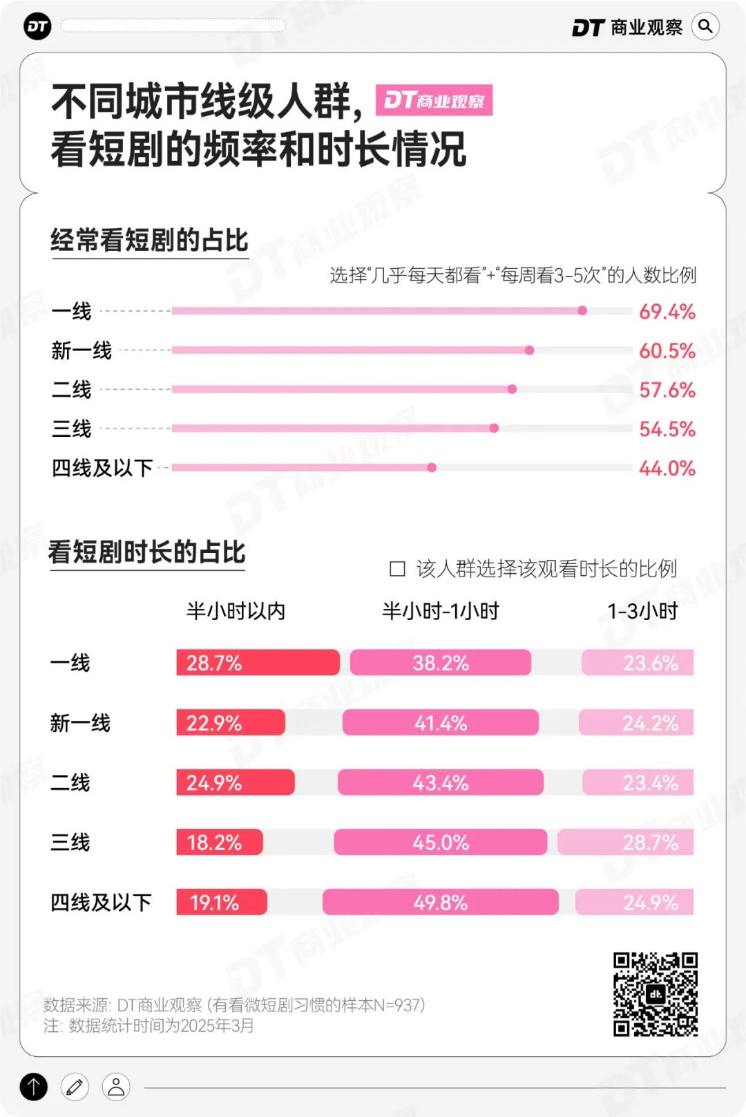 一线城市看短剧更频繁,三四线城市单次看短剧时间更长