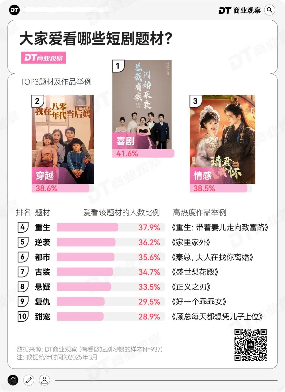 从调研结果来看,喜剧、穿越和情感包揽了最受欢迎的短剧题材前三,然后是重生、逆袭。