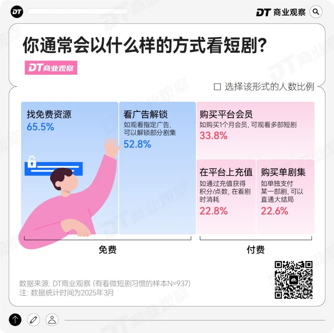 最多人看短剧的方式,首先是找免费资源(65.5%),其次是看广告解锁(52.8%)。