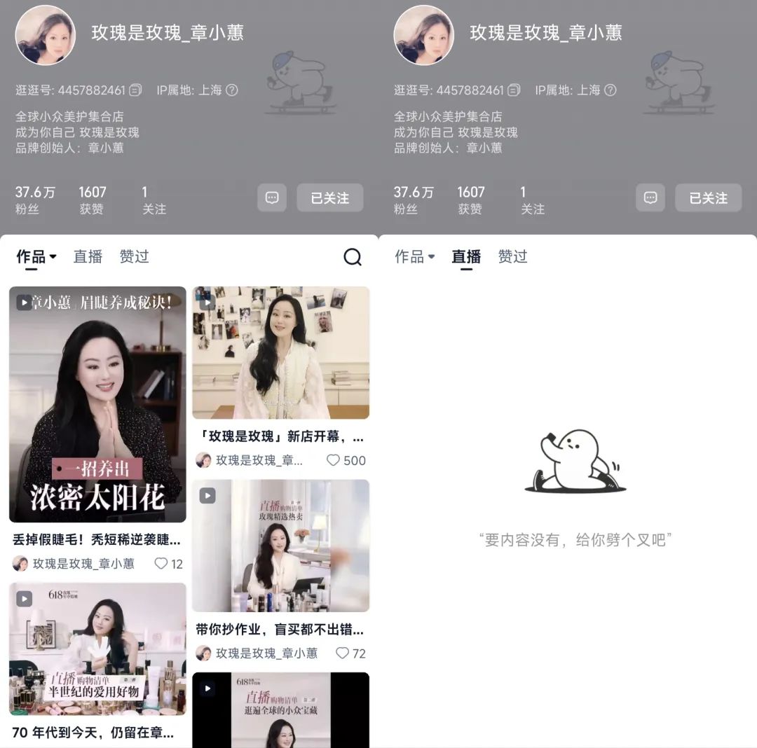 然而当电商平台们纷纷摩拳擦掌加入今年的618战场时,惊蛰研究所偶然注意到,去年618前夕高调入驻淘宝直播的章小蕙,似乎已经悄然停播。在其淘宝账号主页,往期直播回放内容已经全部清空,只剩下32条短视频/图文作品,其中发布时间最近的一条内容,为去年8月29日发布的某睫毛精华液产品视频。