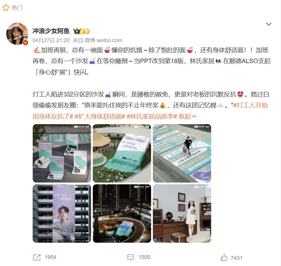 再如4月25-26日,林氏家居在佛山顺德打造限时家具展览,为此在微博上打造的话题叫做#打工人开始用身体反抗了#,借势职场情感传达产品让用户身心舒展、一起扩大身体舒适面的价值,深化了品牌认知。
