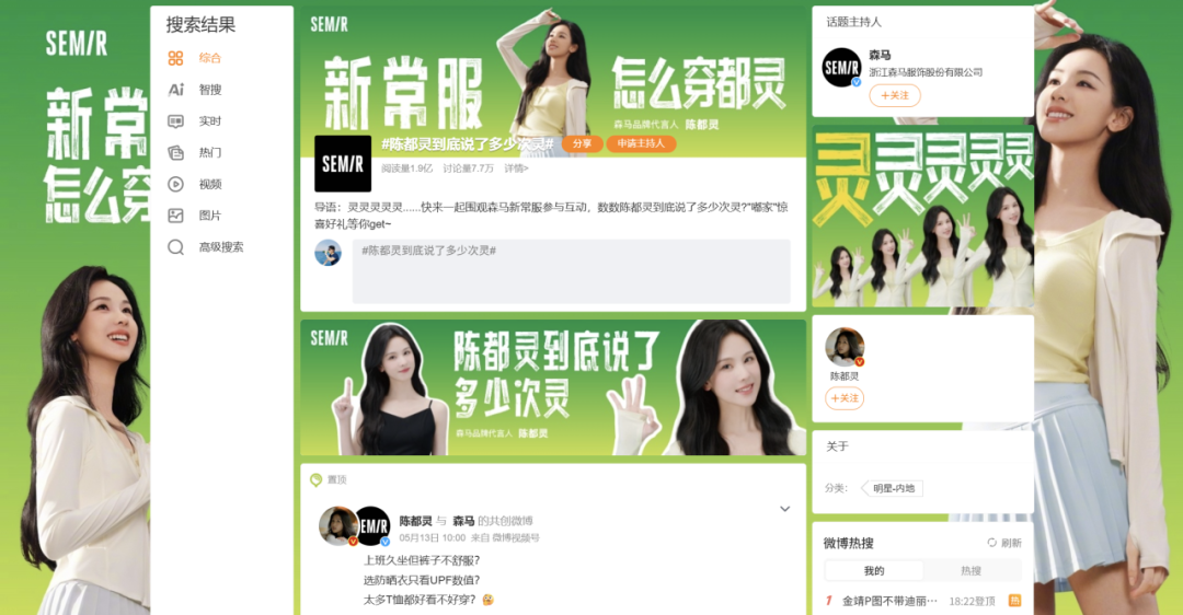 森马在微博上打造的话题就叫做#陈都灵到底说了多少次灵#,让消费者认知到买森马的T恤、裤子、防晒衣,生活就会特别灵。