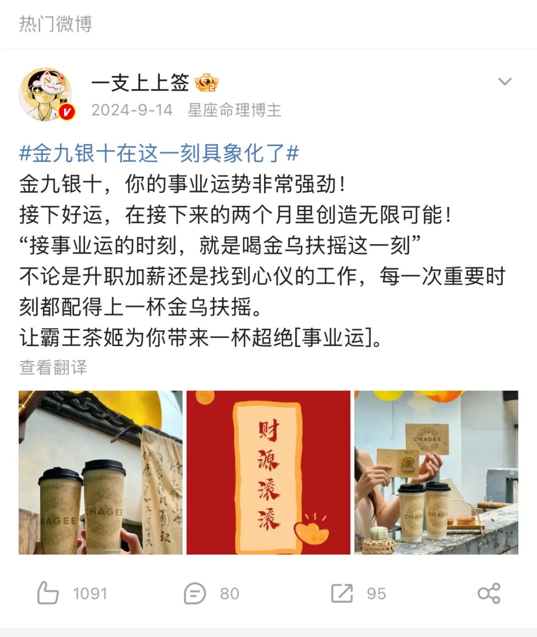 比如#霸王茶姬的新品磁场太强了#、#喝金乌扶摇后中彩票了#、#金九银十在这一刻具象化了#、#开工接好运主打一个心诚则灵#、#十二星座金九银十事业好运#等。
