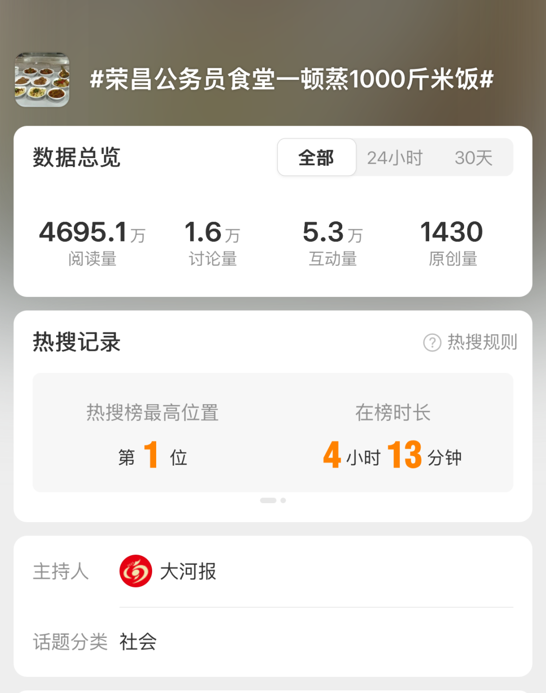 由此,#荣昌公务员食堂一顿蒸1000斤米饭#登上微博热搜,不仅引发网友热议,更引来众多地方政府模仿,纷纷开放自家机关单位食堂和停车场。