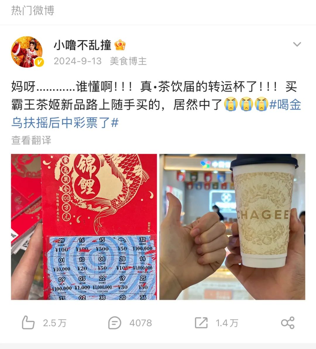 2024年9月,霸王茶姬上新“金乌扶摇”系列新品,同样锚定当代年轻人的这一集体情绪和价值取向,围绕着“接好运““接事业运”打造了一系列传播话题。