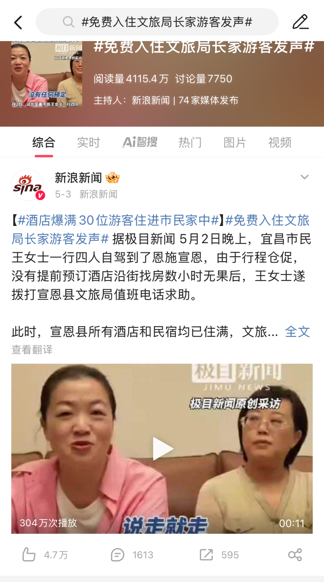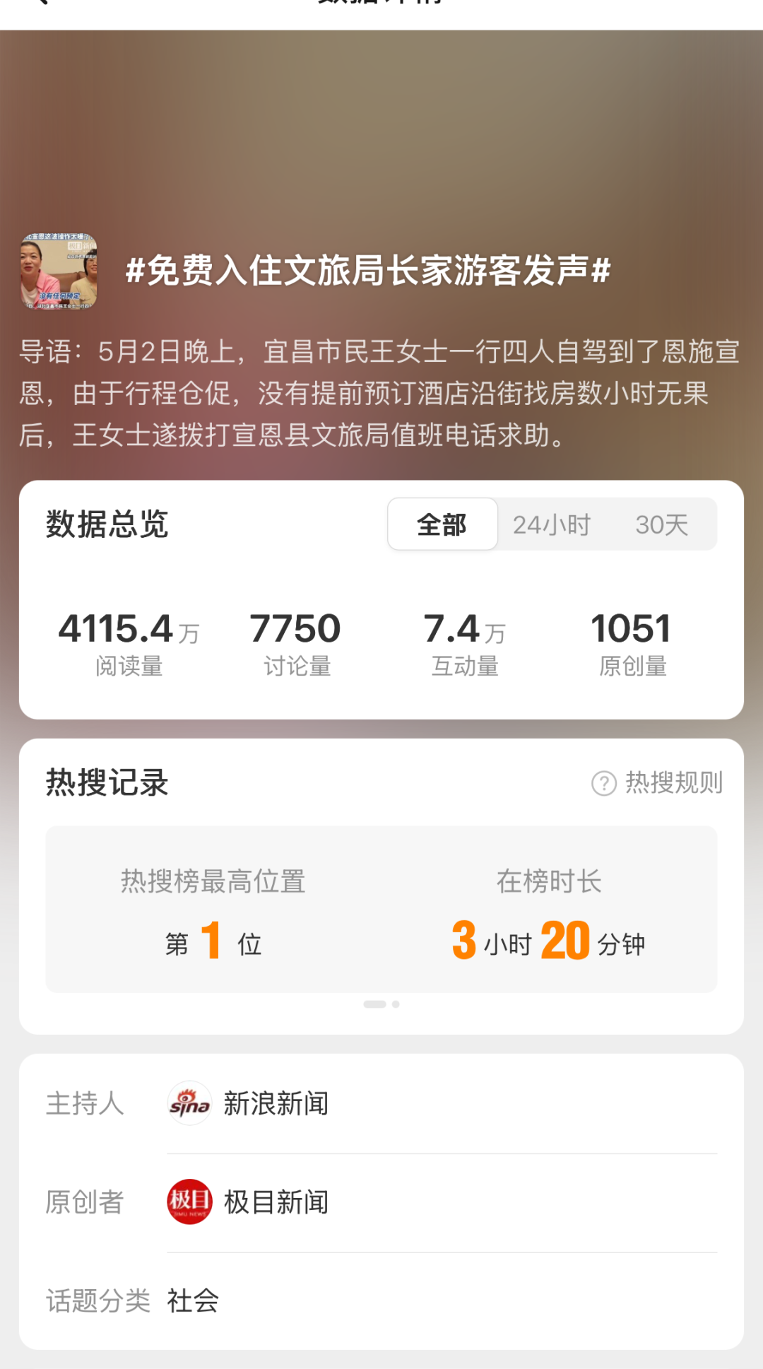 此事亦引发广泛关注和讨论,贡献了#湖北宣恩紧急为游客安排免费床位#、#官方回应游客免费入住文旅局长家#、#湖北一县城3天接待70万游客#等诸多热搜话题。