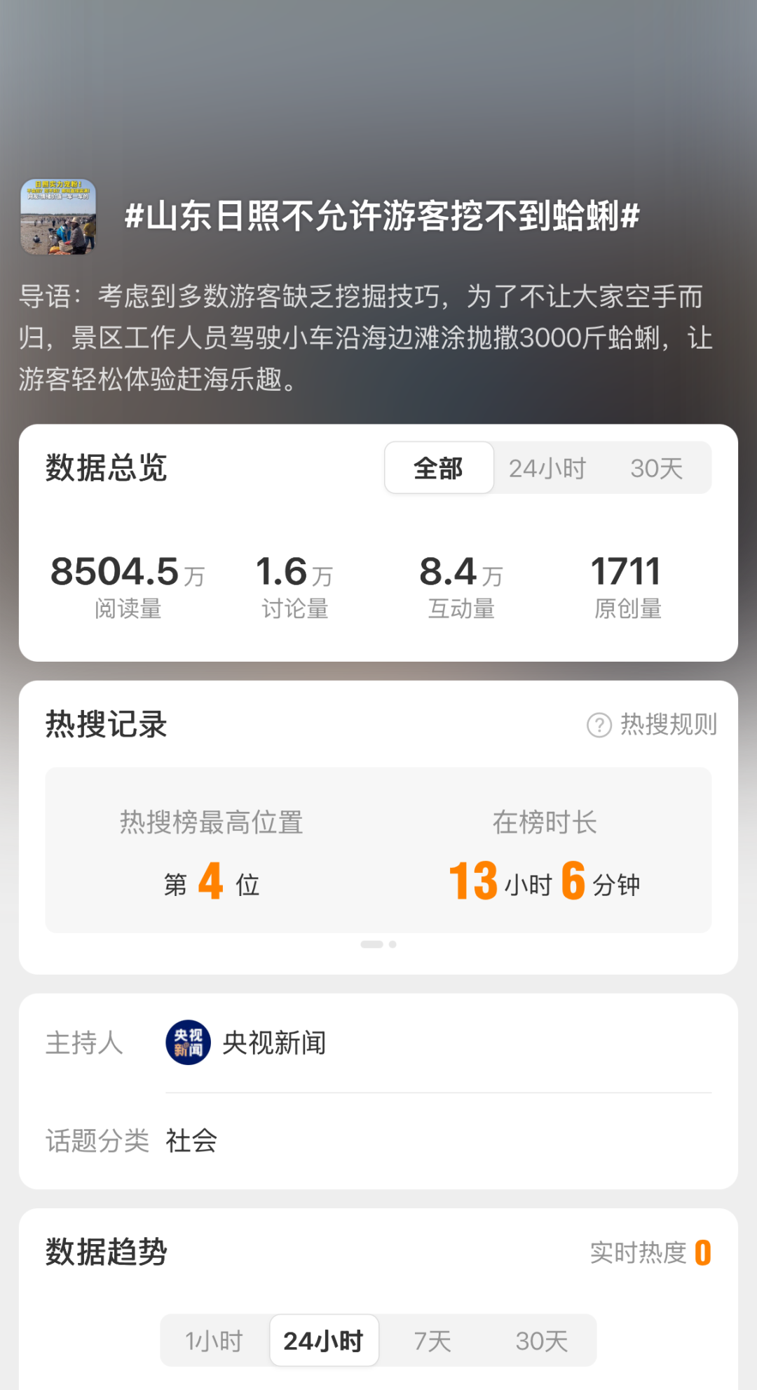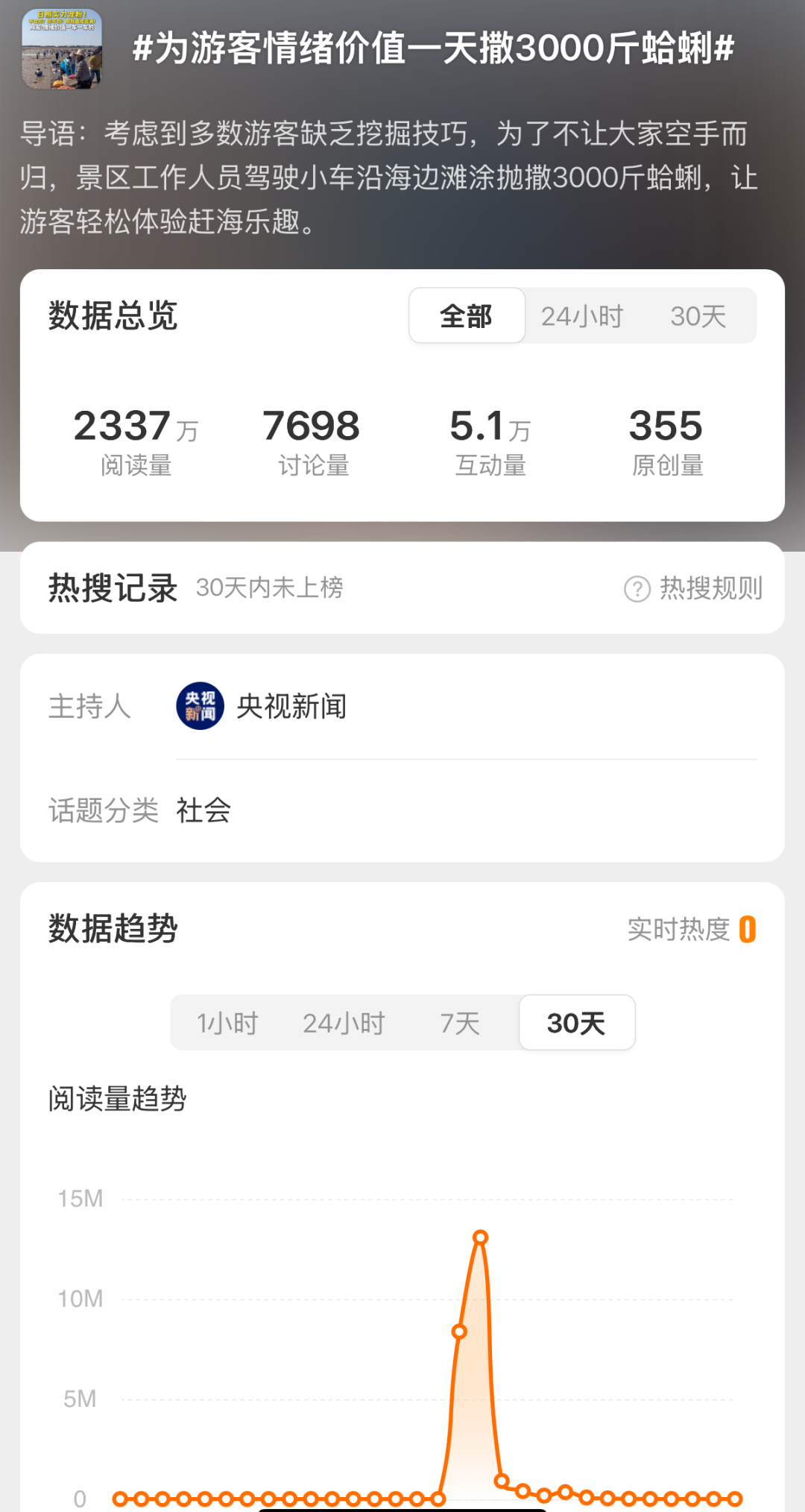 游客去海边,就为体验一把赶海的乐趣。怕他们赶不到海失望而归,一景区工作人员开车沿着海边滩涂抛撒海鲜,一下午撒了3000斤蛤蜊,于是#山东日照不允许游客挖不到蛤蜊#也登上了热搜,引发网友热议。