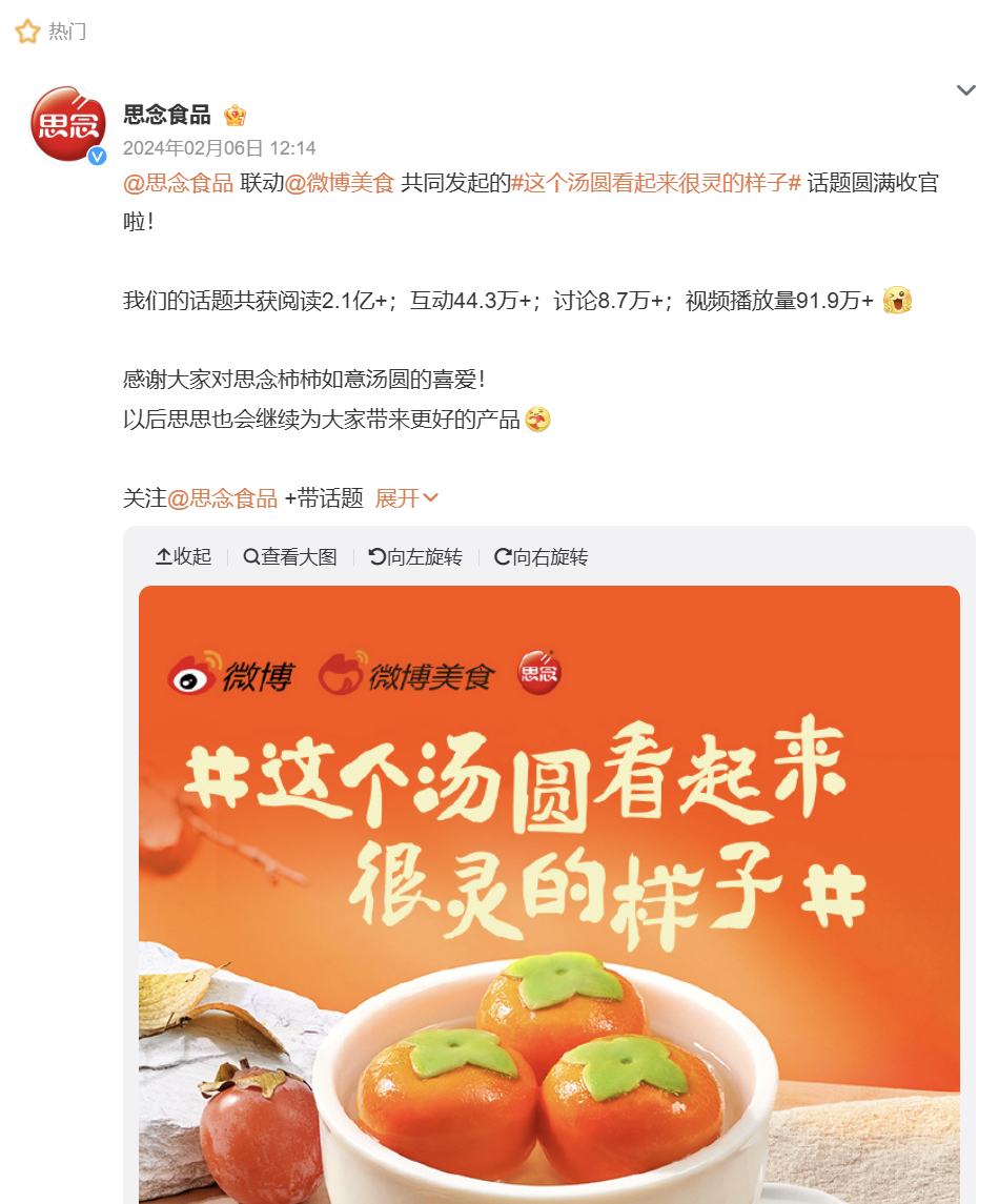 在产品推广中,思念还联动@微博美食共同发起了#这个汤圆看起来很灵的样子#这一热搜话题,引爆了社交流行。整个话题共收获阅读量2.1亿+、视频播放量91.9万+、互动44.3万+;讨论8.7万+等等,不仅实现产品热销,且形成了差异化品牌认知。