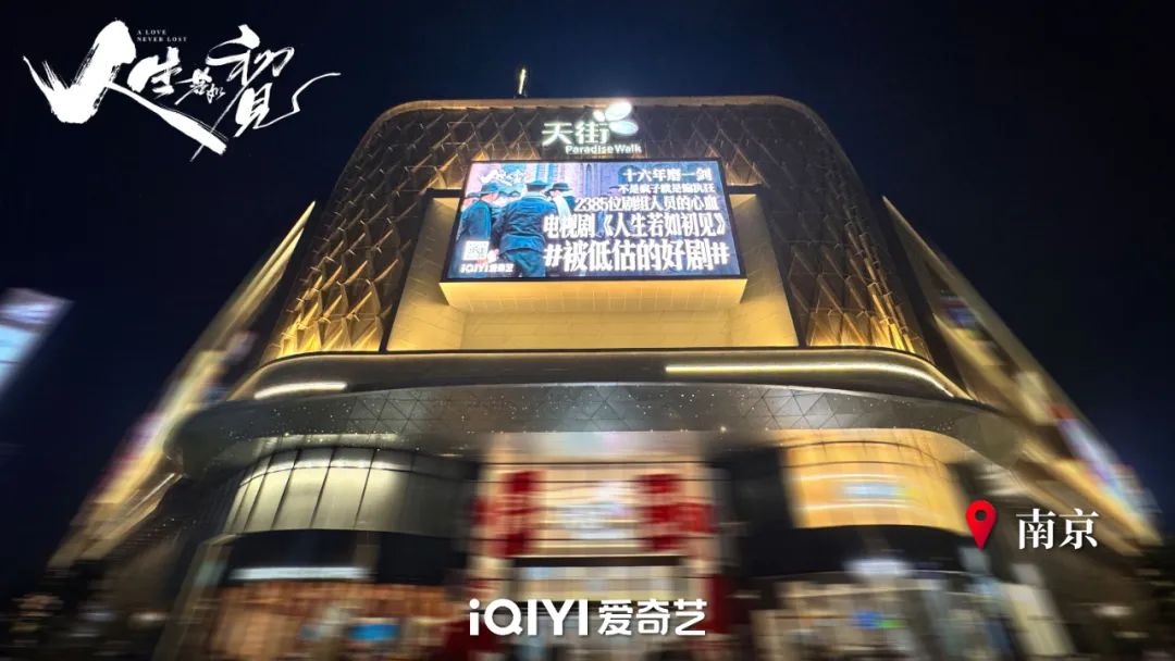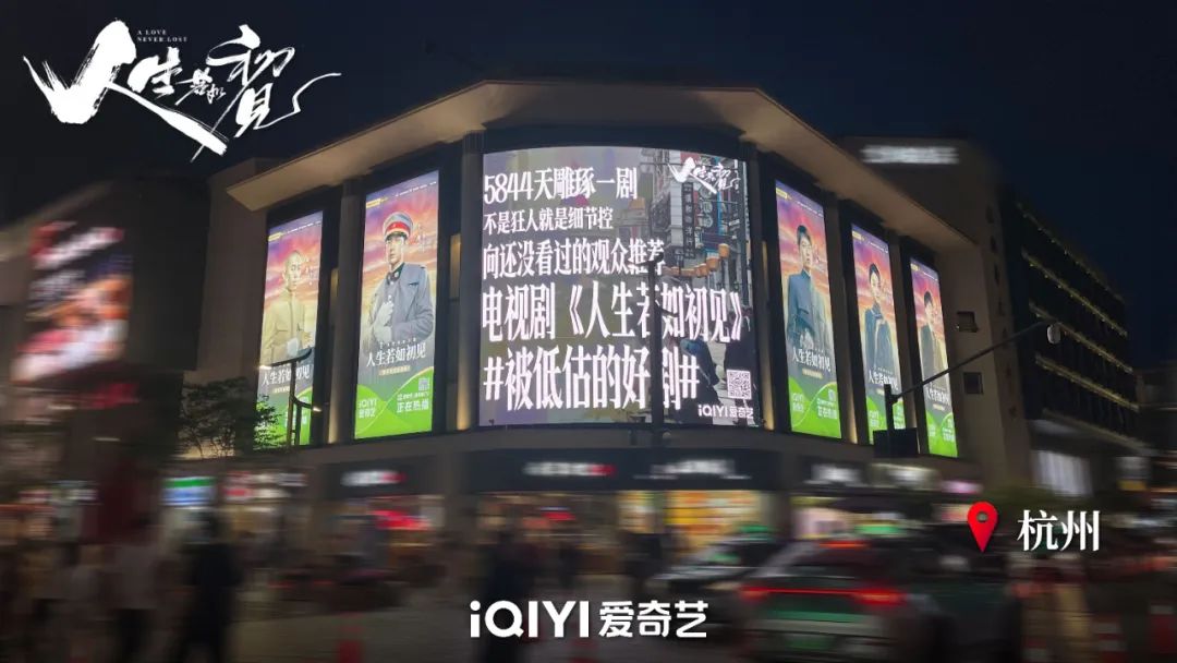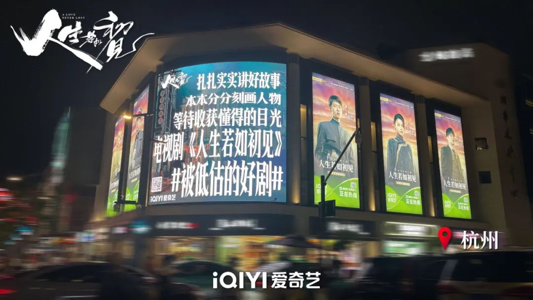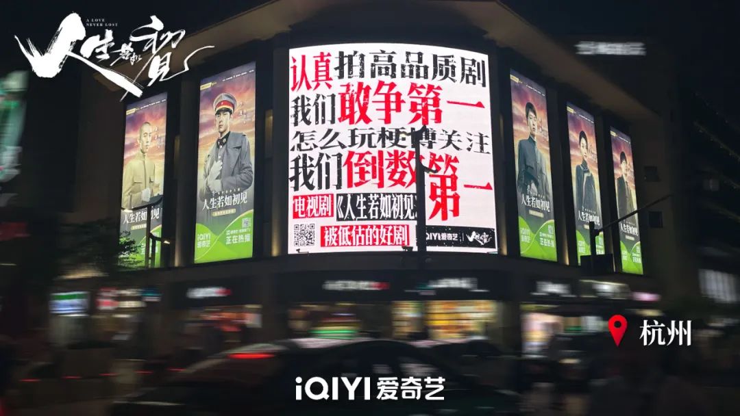 最近,电视剧《人生若如初见》将迎来大结局,独播平台爱奇艺在杭州、北京、上海、南京、烟台等城市投放商场户外大屏广告。宣传文案以大字报的形式打直球,吐露制作心血成本之大,毫不留情自称玩梗博关注是倒数第一,不玩形式只看内容,以此来推荐这部“被低估的好剧”。