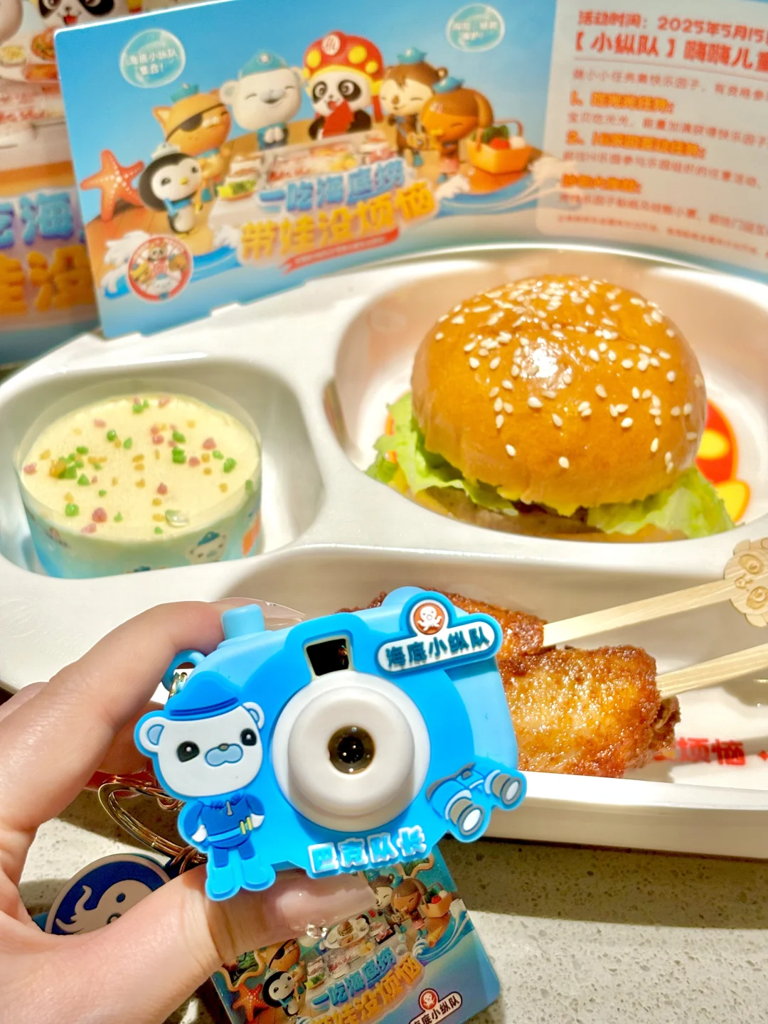 购买29.9元的“小纵队嗨嗨儿童餐”可随机获得6款投影相机中的一款;购买“海底欢聚家庭套餐”则可以获得水杯或帽包。