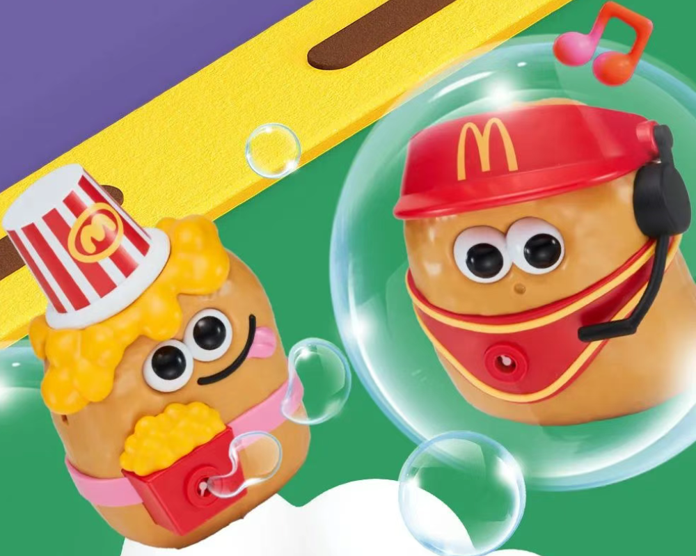 5月30日再上架麦乐鸡泡泡机。泡泡机有两种样式,分别是麦乐鸡拟人化出来的“呆呆打工人”和“萌萌搞怪仔”,配备Eva Cremers设计的童趣贴纸,以及彩色挂绳。