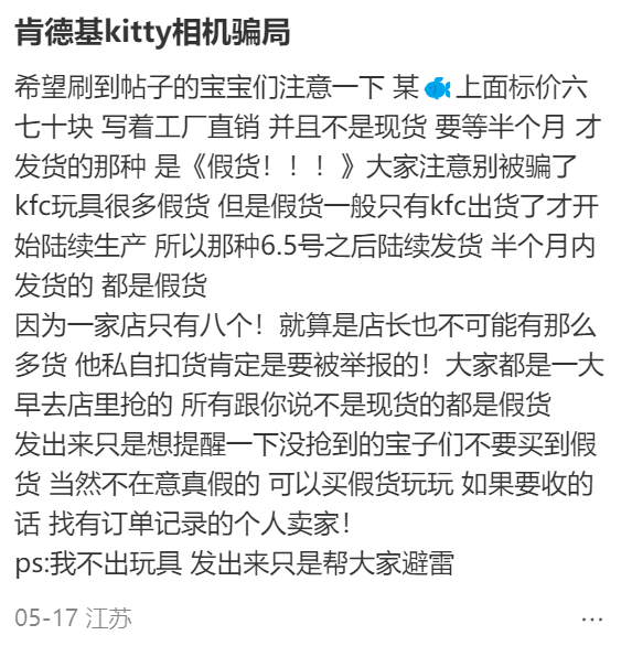 从五月初开始,肯德基联名三丽鸥的儿童节套餐团购券就在抖音直播间被哄抢,哪怕肯德基后来在直播间摆出醒目大字“玩具下架了”,评论区还是不断有人问,还有儿童套餐的券没?