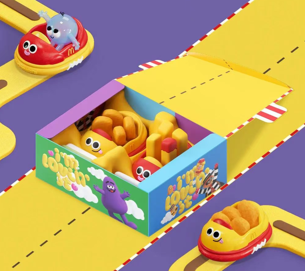 5月23日驶来的是麦乐鸡薯条碰碰车。这套玩具包含两辆遥控碰碰车,一辆装的是薯条模型,一辆装麦乐鸡,两辆车的遥控器也分别设计为和薯条、麦乐鸡配套的番茄酱和甜酸酱样式。