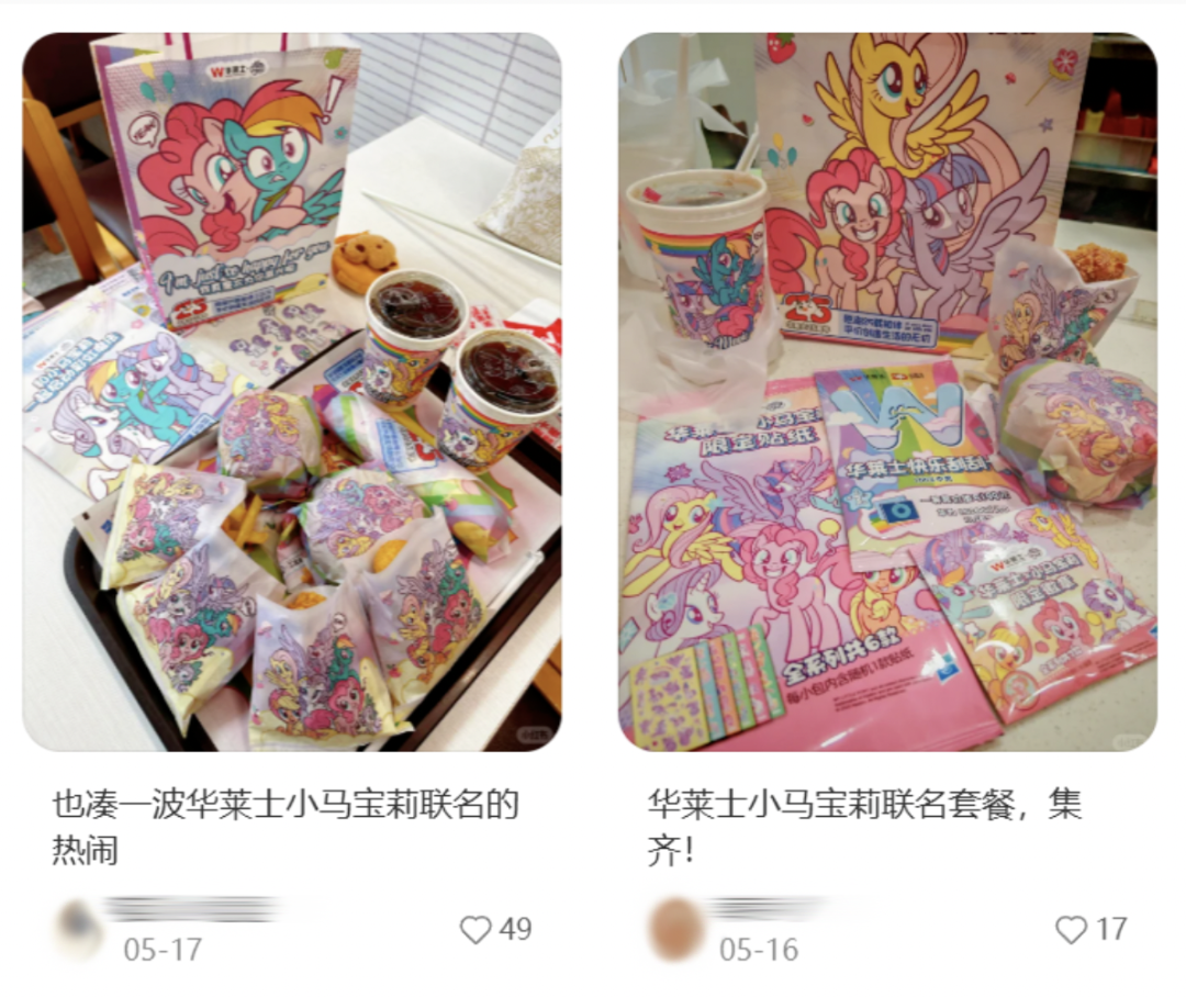 看得出来华莱士对“谷子经济”做了一番深入调查,市面上流行的“谷子”(goods音译,泛指围绕IP衍生的周边产品)都齐了:贴纸、徽章、流麻、刮刮卡,连食品包装纸都是小马宝莉“痛纸”。一份套餐端上来五彩斑斓,洋快餐摇身一变成“漂亮饭”。