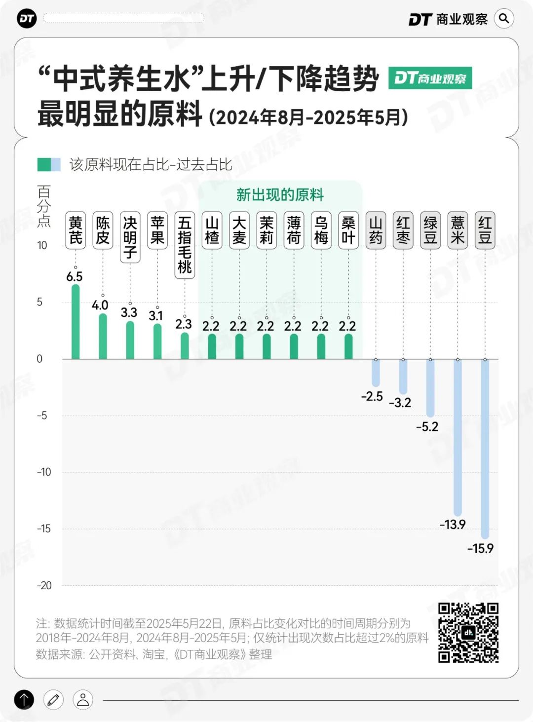 为了看出变化,我们手动统计了2024年8月至今(2025年5月)养生水新品原料和2024年8月以前的养生水新品原料,并进行对比。