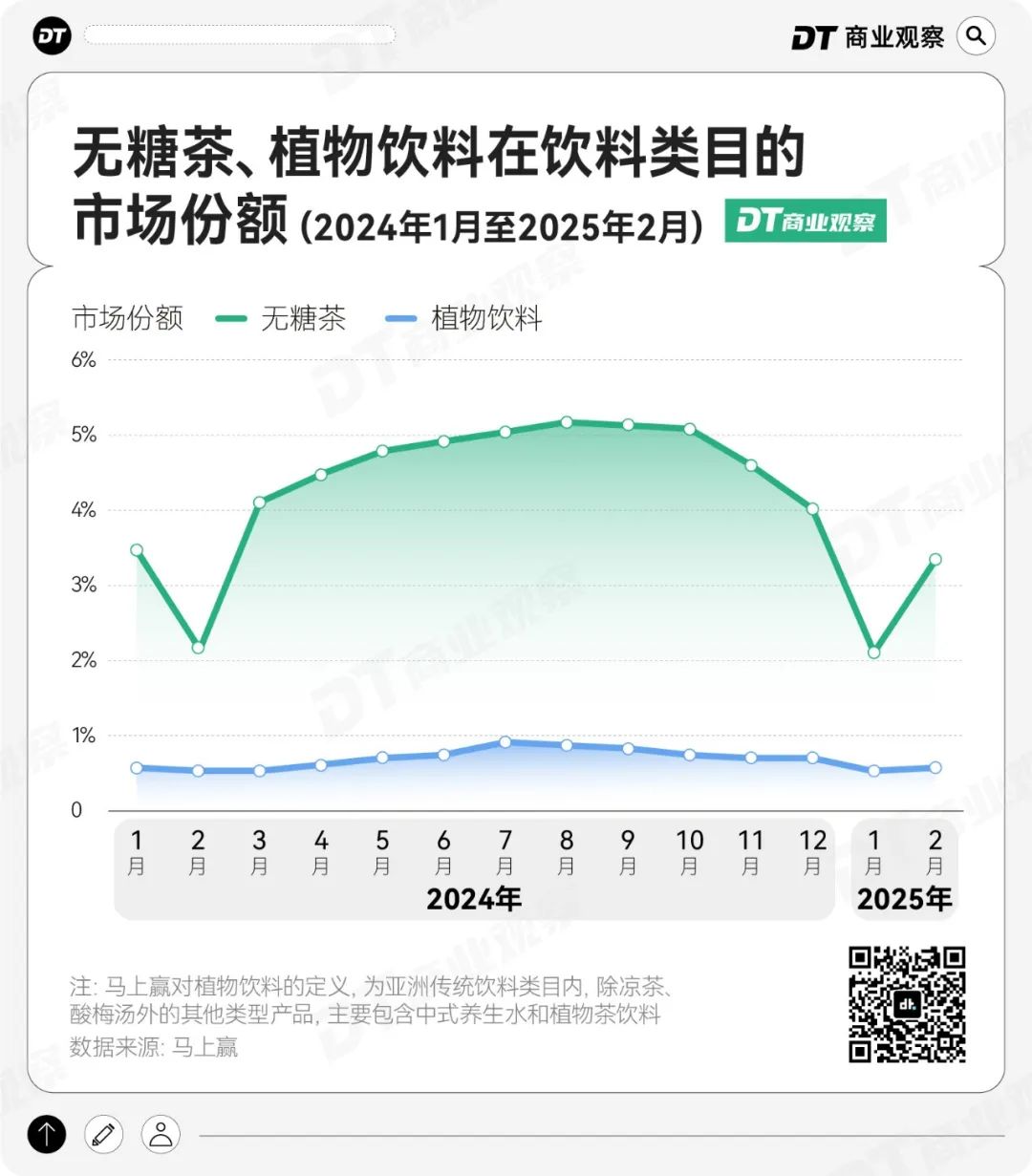 二,根据马上赢数据,2024年Q2-2025年Q1,无糖茶在饮料大品类的份额大概是2-5%,而植物饮料(包含中式养生水和植物茶饮料,不包含凉茶和酸梅汤)的占比基本维持在0.5-0.9%之间。