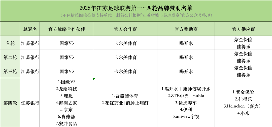 外界无从得知其中的缘由。但刺猬公社从第一轮到第四轮赞助名单里发现,“苏超”从第一轮办到第四轮,前三轮的赞助名单保持不变,也一直保持着总冠名、官方战略合作伙伴、官方合作商、官方赞助商、官方供应商5个等级。