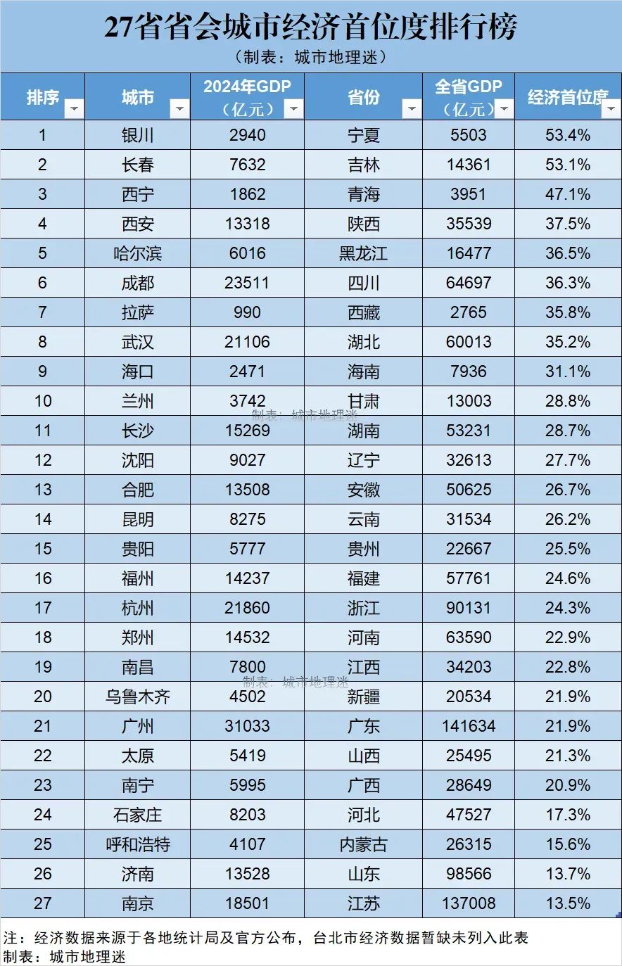 和别的省份省会一家独大的虹吸效应不同,江苏各市经济势均力敌,甚至苏州市的GDP比省会南京还要强得多。在2024年,南京在全国27个省会城市经济首位度的排行榜中垫底。