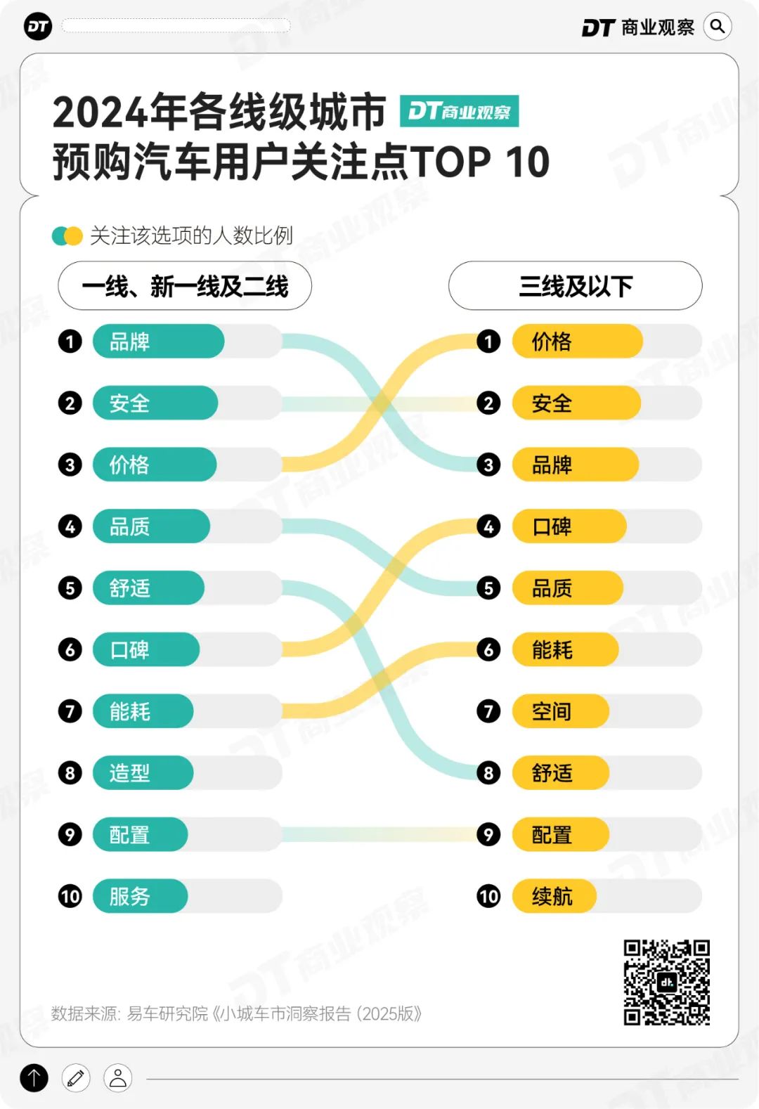 相比较大城市消费者选车时最看重品牌,小城用户在选购车时,最关注的是价格,其次才是安全与品牌。