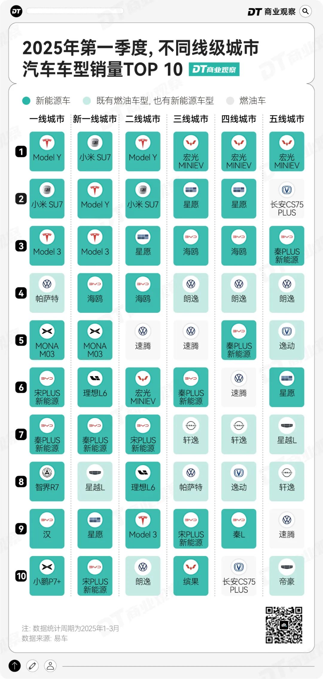 下沉市场的新能源热潮与差异,首先体现在了畅销车型的榜单上。根据易车榜发布的2025年1季度各线城市车型销量排名,不同线级人群对车型的喜爱程度展现出比较大的差异。