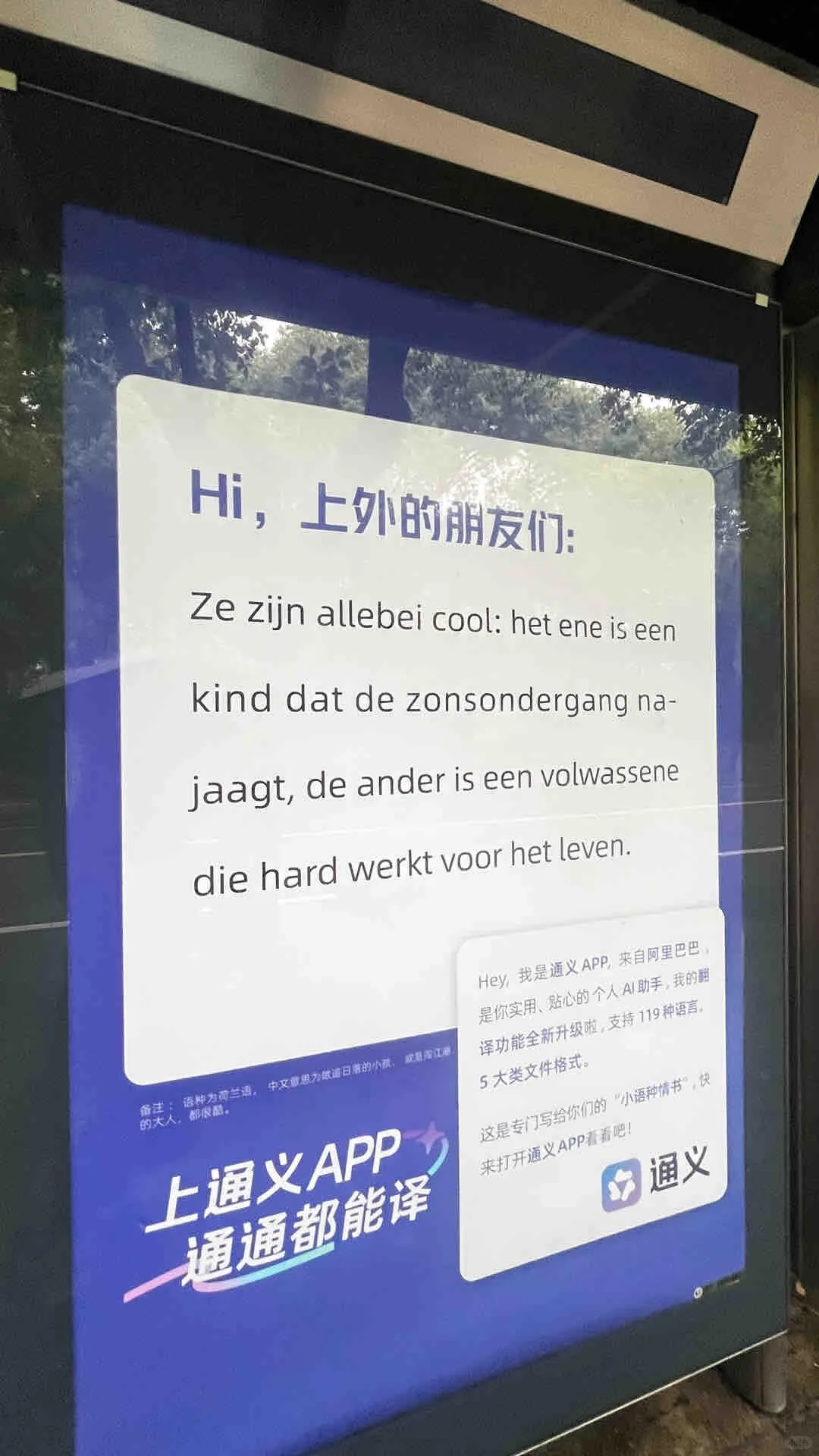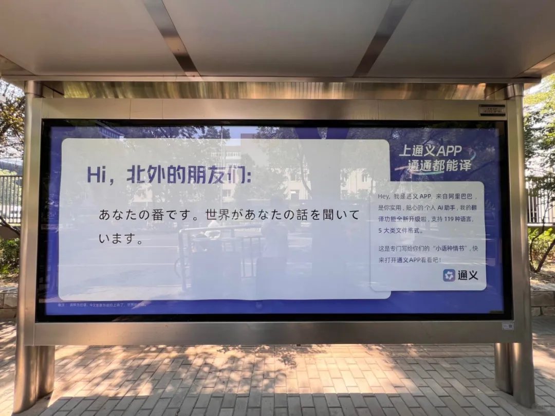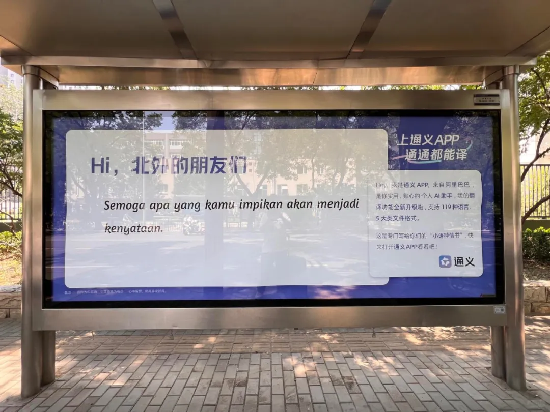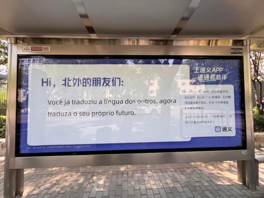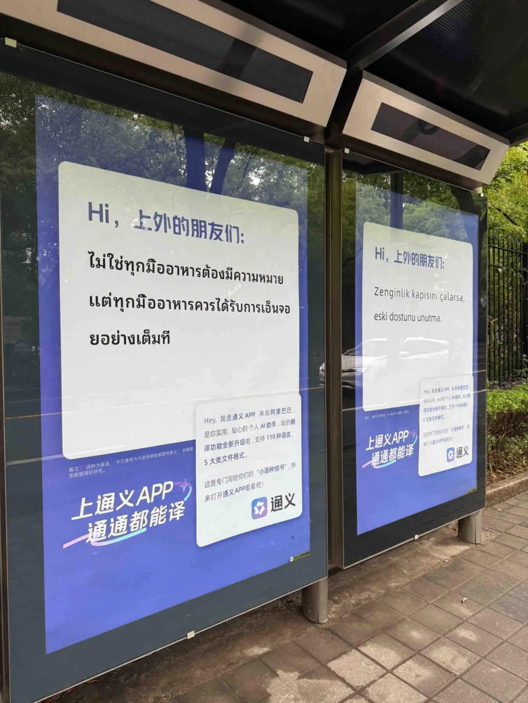最近,为了推广旗下AI助手通义APP的小语种翻译功能,阿里把广告海报投放到了 北京外国语大学周边的公交车站牌上,并且用小语种喊话北外的同学们。这给路人看,不就是加密对话的程度。