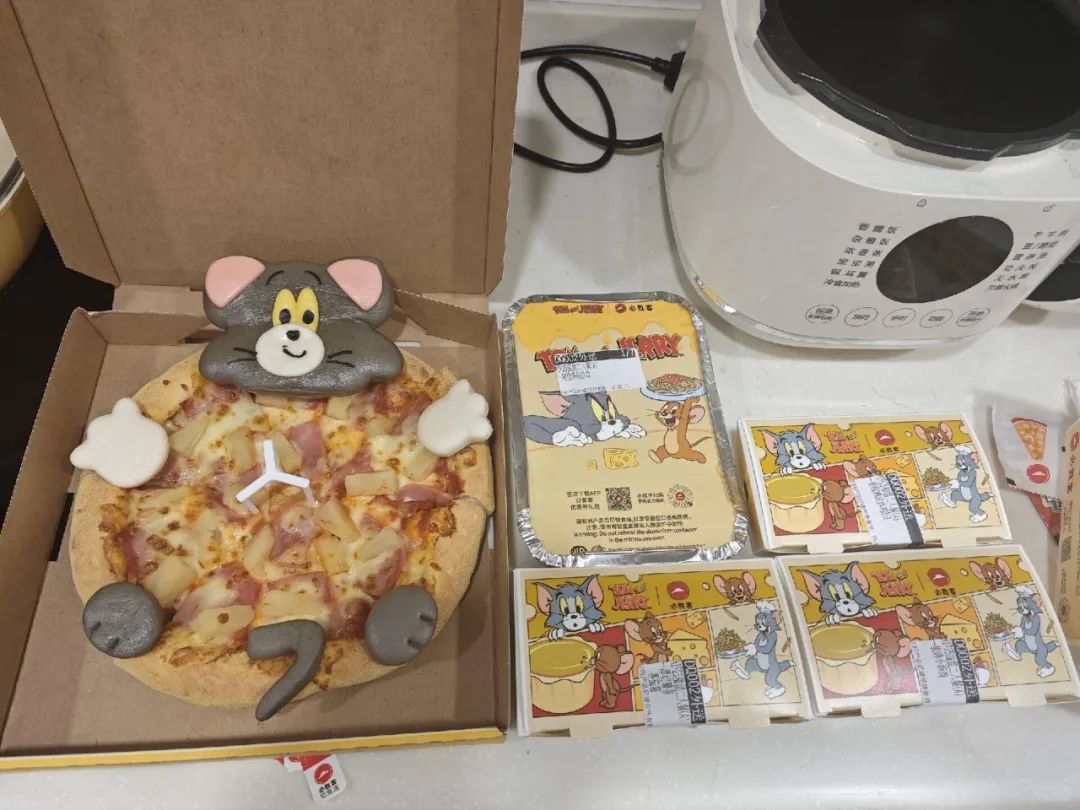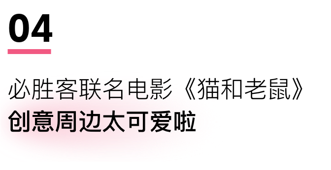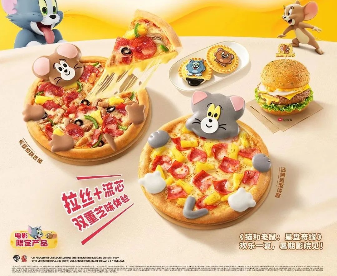 6月30日,必胜客与电影《猫和老鼠:星盘奇缘》的联名套餐开售。联名限定产品包含汤姆、杰瑞造型披萨,奶香洞洞芝士,汤姆、杰瑞款黑芝麻流芯芝士挞,和芝士厚汉堡。