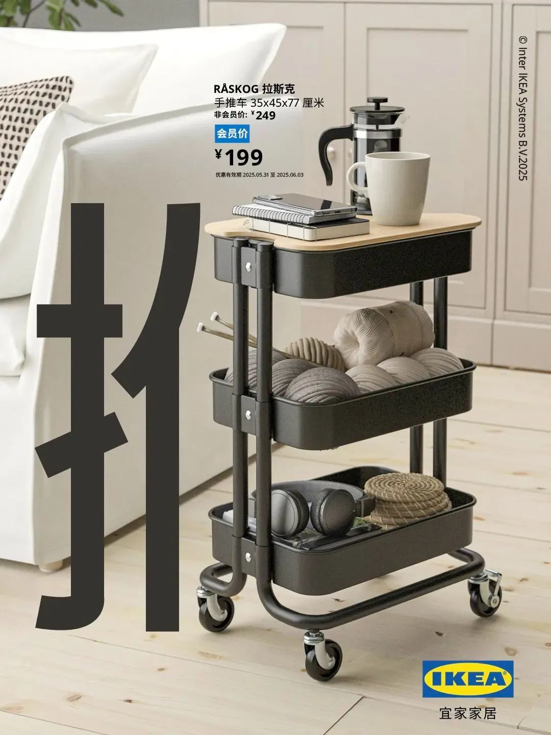 设计师将宜家经典产品:冰枕、抽屉柜、书架、推车等,解构、变形,巧妙地嵌入汉字的结构笔画中如“凉”字的口框变冰枕,“柜”字的一竖变书架。