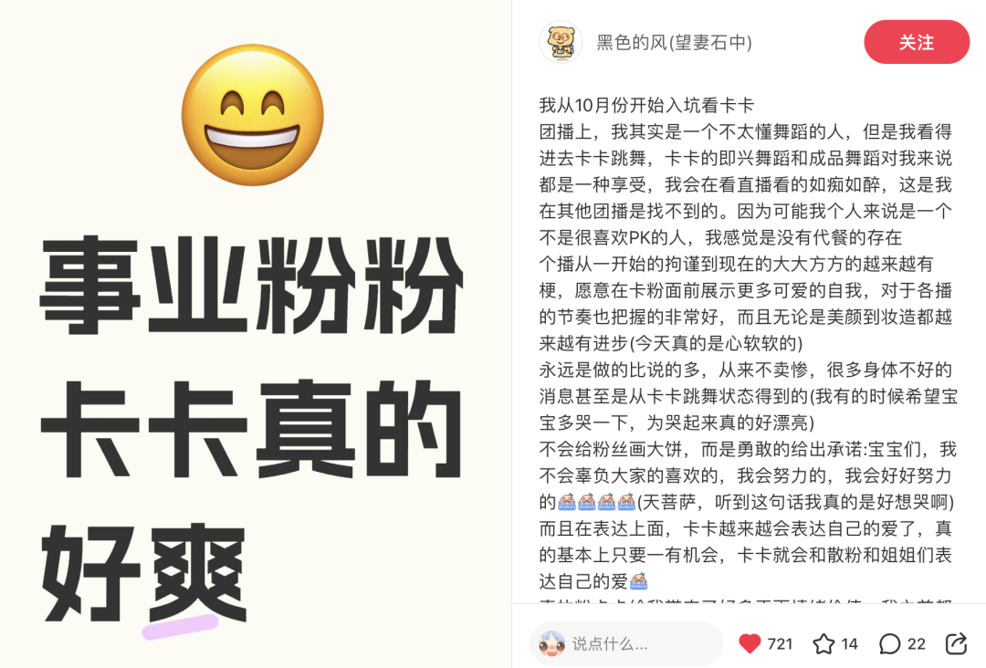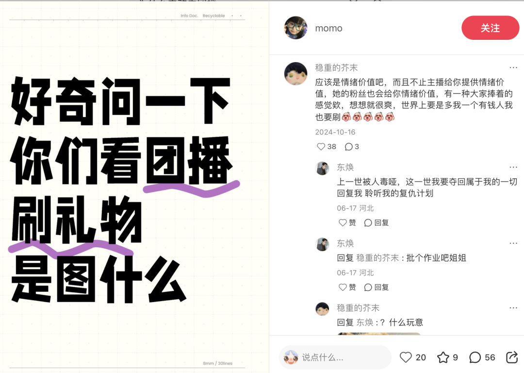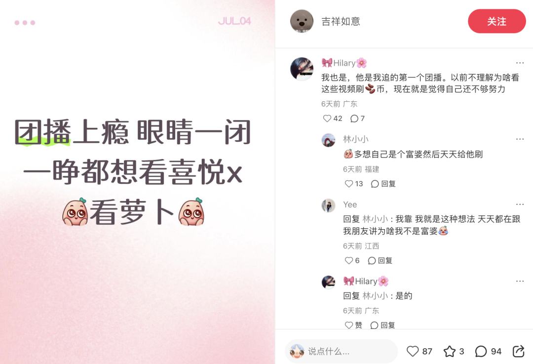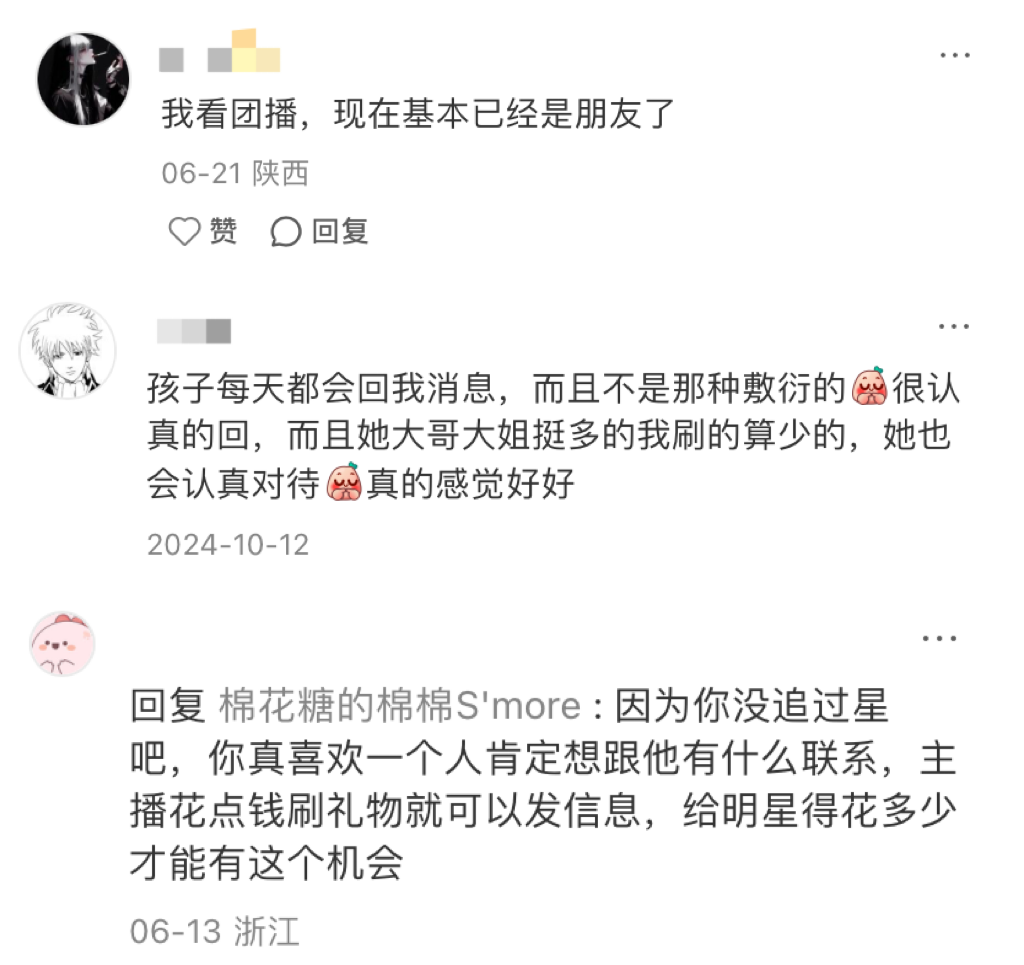 一入团播深似海。社媒上,不少女性用户分享起自己从路人变成真爱粉的故事——“谁懂,我原来完全不看的,现在着魔似的天天打榜。”