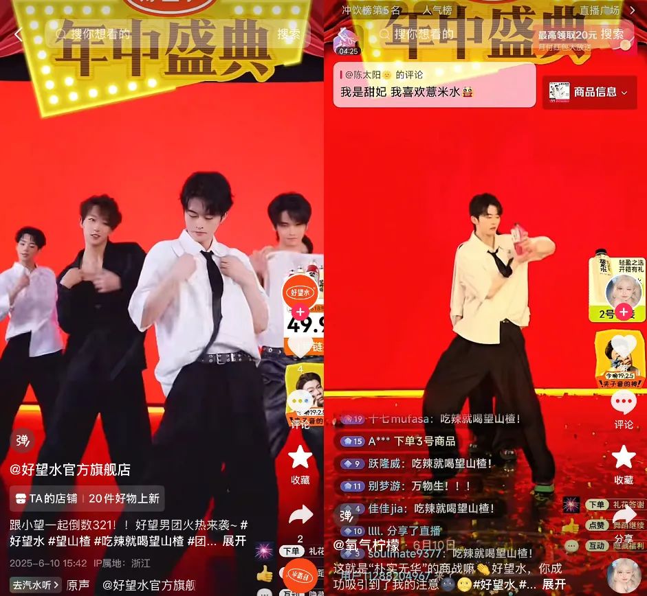 和团播直播间的打赏、打 PK 等娱乐导向有所区别。为了平衡好娱乐性和商业性,好望水在团播直播间内不引导打赏,同时又通过挂商品小黄车、打造符合品牌调性的直播场景、安排产品为道具、设计符合产品卖点的舞蹈等形式,加强团播与品牌之间的相关性。