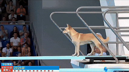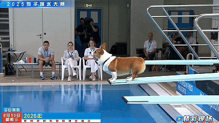 除了猫咪跳水,汪汪队也不甘示弱,纷纷站上跳水台。中华田园犬完美起跳, 180 度转体,动作行云流水,太精彩了。
