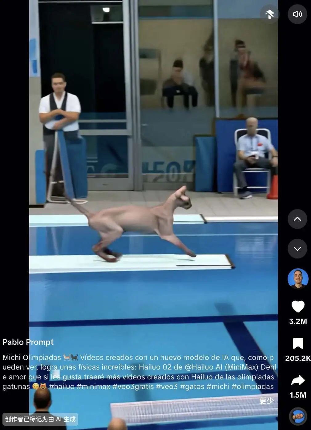 最近,国外博主 Pablo Prompt 在社交平台上发布了一条猫猫跳水比赛的短视频,直接引爆全网,截止目前点赞数已超 320 万次。