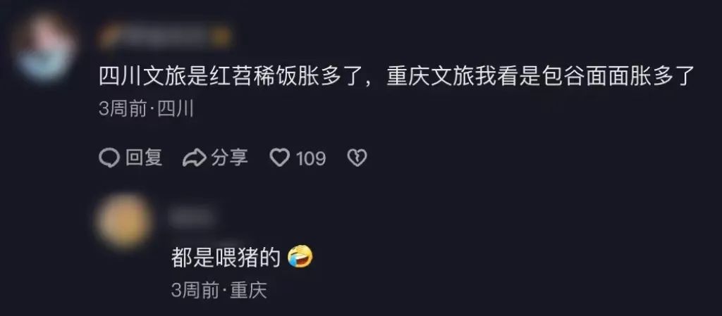 更有网友辣评:四川文旅是红苕稀饭胀多了,重庆文旅我看是苞谷面面胀多了,都是吃饱了撑的,在互联网上搞抽象。