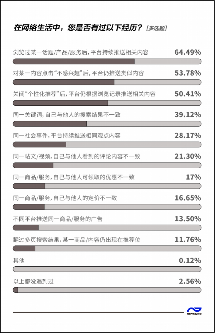 据南都大数据研究院2024年12月发起的问卷调查结果显示,近98%的受访者表示在互联网遭遇过算法带来的困扰。调查中,反映个性化推送问题的受访者占比最高。64.49%的受访者表示浏览过某一话题/产品/服务后,发现平台持续推送相关内容;同时53.78%的受访者反映,自己对该类内容点击“不感兴趣”后,平台仍推送类似消息;更有50.41%的受访者表示,关闭“个性化推荐”后平台仍根据浏览记录推送相关内容。