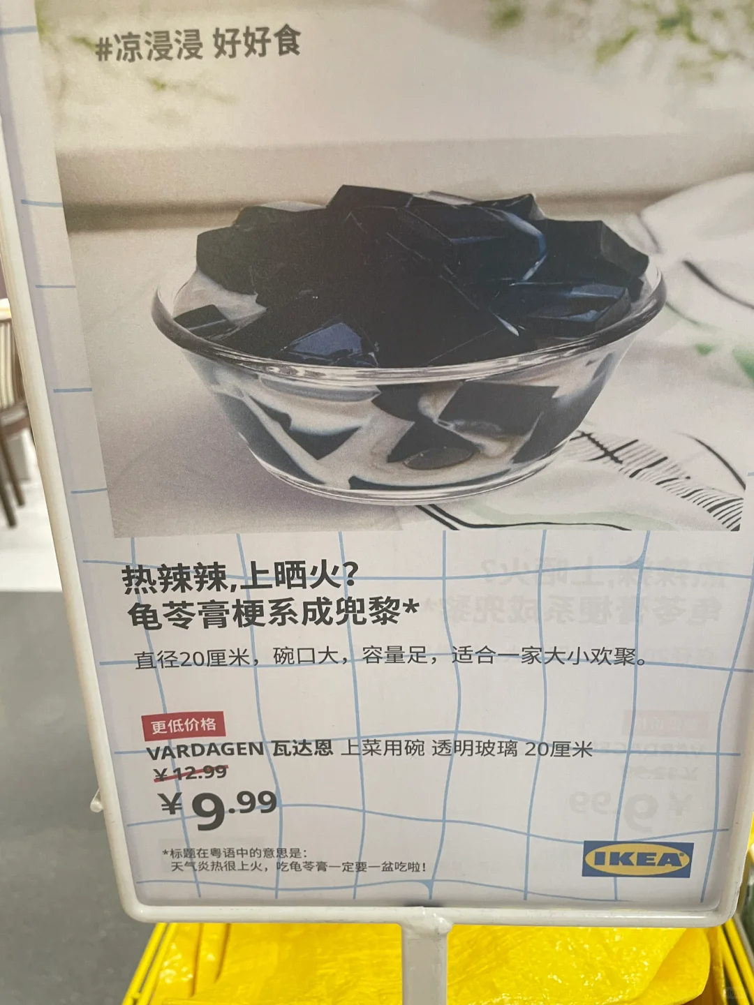 卖玻璃碗:热辣辣,上晒火?龟苓膏梗系成兜黎。