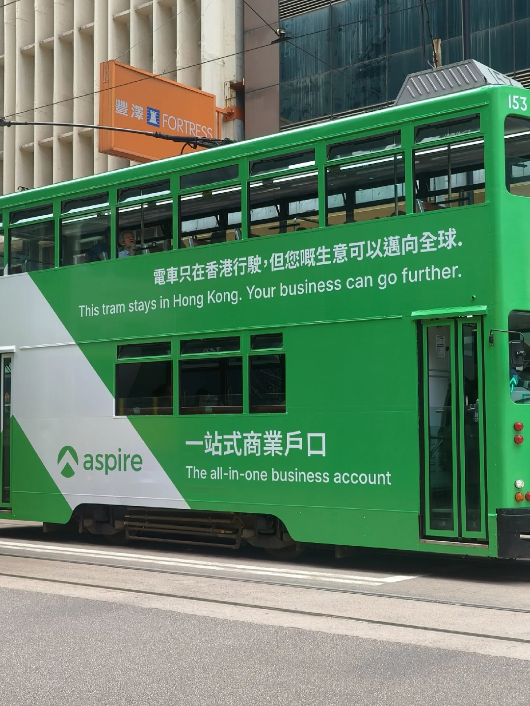在城市电车上金融科技公司 aspire 写下:電車只在香港行駛,但您嘅生意可以邁向全球(电车只在香港行驶,但您的生意可以迈向全球),扣紧香港电车这个本地特色,也清晰传递了品牌优势,场景贴合,一点也不突兀。