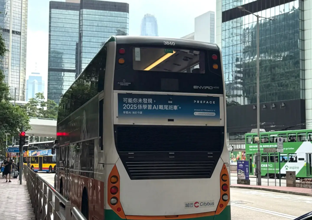 Preface 还在公交车的后窗下投放了一句非常应景的粤语文案:“可能你未發現,2025 係學習 AI 嘅尾班車”。