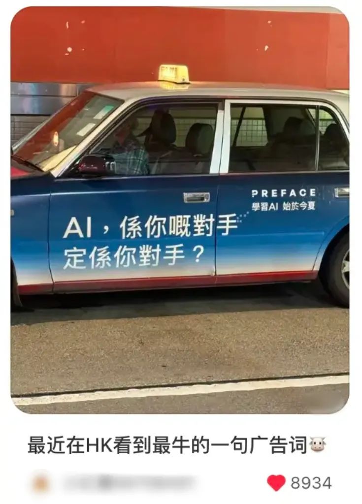 在上网冲浪时阿广刷到一张图,香港出租车车身上的广告语:“ AI ,係你嘅對手,定係你對手?”