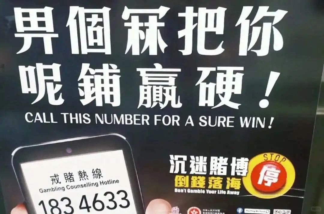 禁止赌博的公益广告直接整了个反套路:畀个冧把你,呢铺赢硬(给你个暗号,这一局肯定赢),看着像赌场里的怂恿话术,结果下面甩上了一串电话号码,原来真正能帮赌徒赢下这局的“暗号”是戒赌热线的号码。