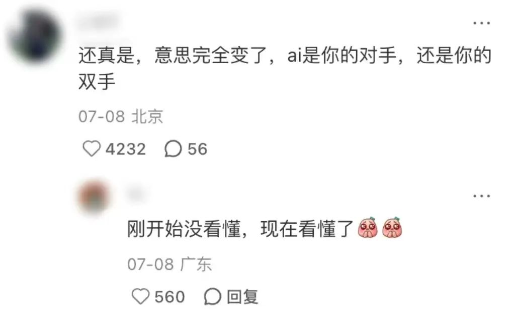 第一眼还没看懂这句文案的“伟大”之处,直到看完网友的翻译后恍然大悟,“ AI ,是你的对手,还是你的一对手?”