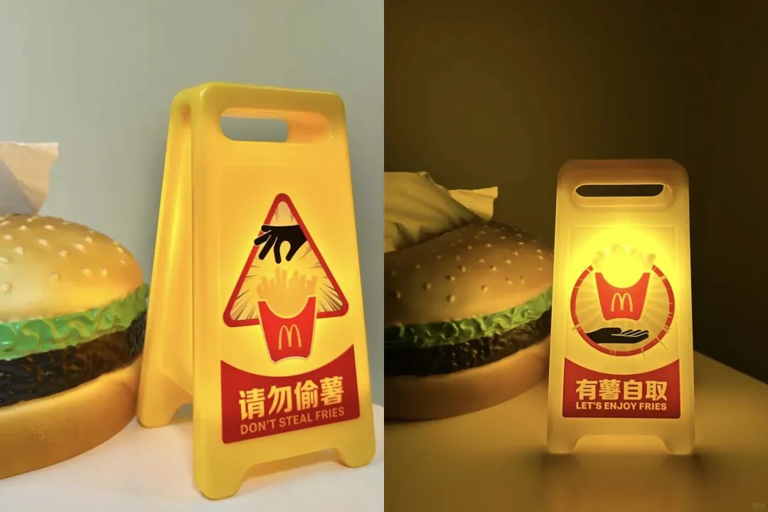 结果有网友灵光乍现,提出了这个玩具的 Bug :当你想偷薯条的时候,如果发现有“请勿偷薯”的防御,只需要绕道它的背面,这个牌子就会不攻自破。