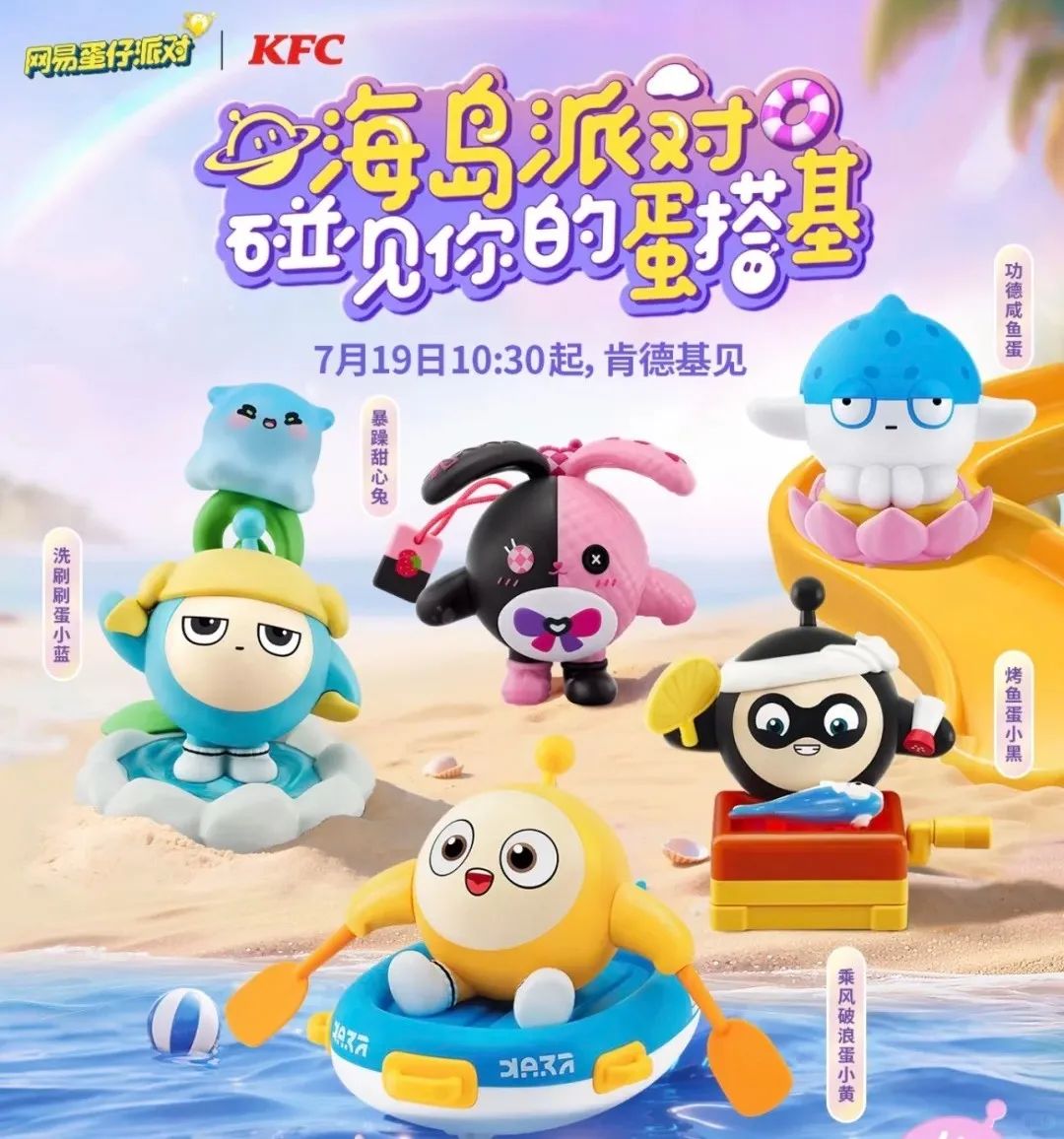肯德基就很懂大家,直接跟蛋仔派对贴贴,推出五款小玩具:烤鱼蛋小黑、乘风破浪蛋小黄、洗刷刷蛋小蓝、功德咸鱼蛋、暴躁甜心兔。