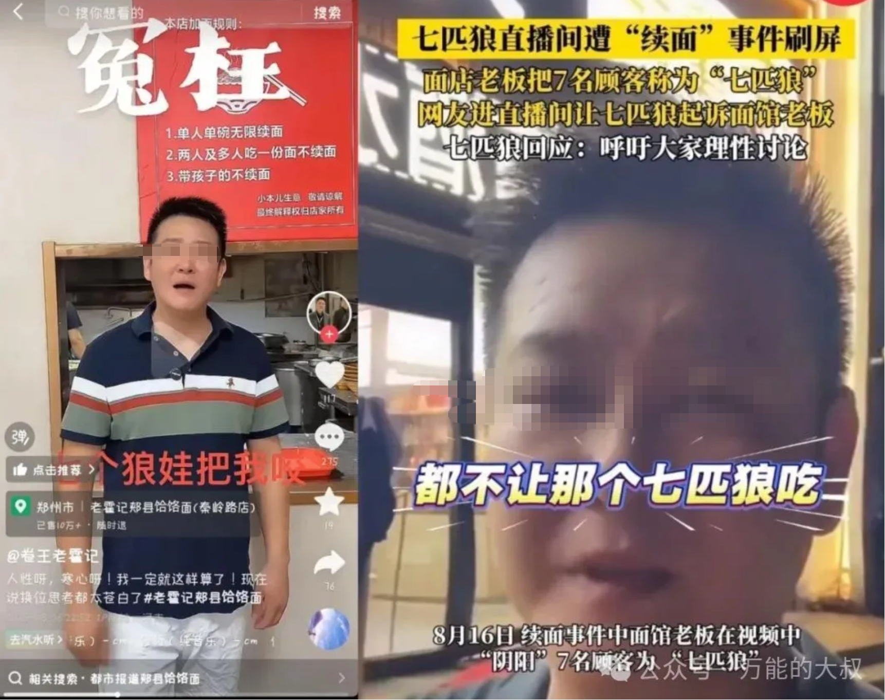 面馆老板在视频中,还“阴阳”7名顾客为“七匹狼”。